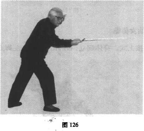 接前式o右手剑经腹前,削向东方,手心向南,停 在与肩齐平;同时右脚跟为轴,脚尖转向东方,左脚 跟转向西方,成右弓步,身体亦转向东方。眼看剑尖 (图 126) o