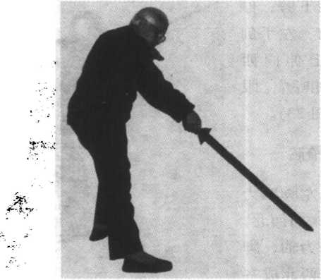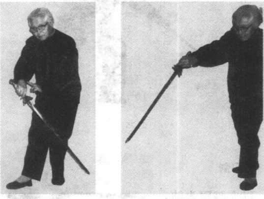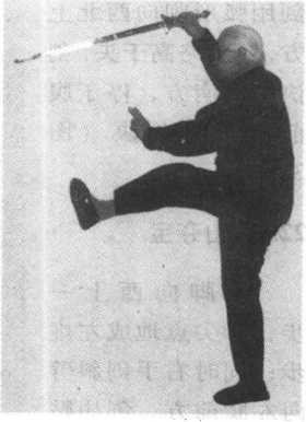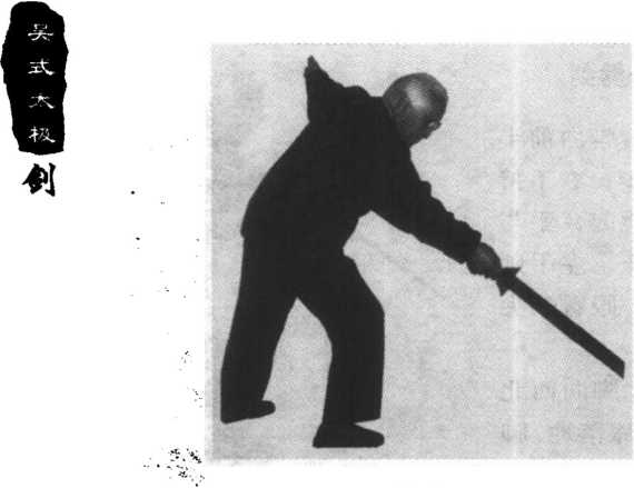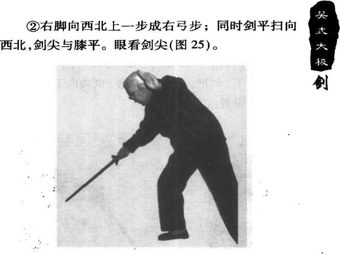 右手剑划立圆,剑 尖向东南下劈,停 于右膝前,左手剑 诀斜向上伸向西 北,与剑相呼应。眼 看剑尖(图23)。