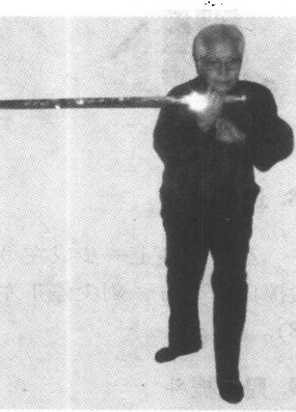 ①右脚向前半 步成弓步;右手持 剑向上挑起,手与 头平为止,左手到, 诀不变。眼翥色I尖 (图 22)° .