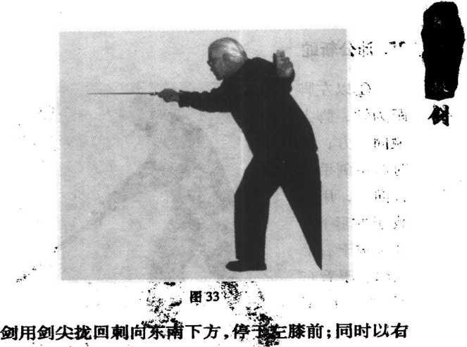 右脚向西一步成 右弓步;同时右手剑 手心向上削向西北上 方,剑尖略财头,剑 诀指向南方二眼看剑 尖(图 33)。' .