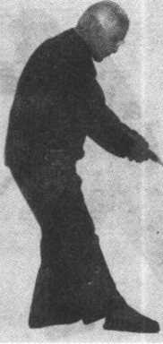 ①以左脚: 例跟为轴,脚时 撇向东方;商 时右手剑手卷: 转向下,用到 截于左膝前; 剑诀按于右手 腕部。眼看东 下方(图 35) o