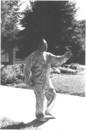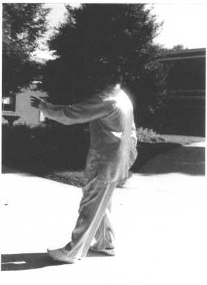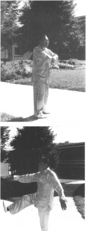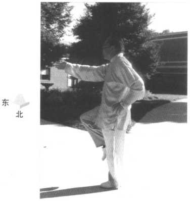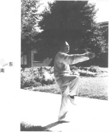 另一面图两臂随即由下而上、向 前往左同时反撩,右脚前 蹬。然后右腕转180。至掌心朝左,悬臂不动;左手回握,附 在左腰旁。右腿亦收回挂起,膝与胯平,脚尖指地。如下页 连续二图。这是快拳中的中定劲动作,单脚支撑,完成动作时不 能动摇。另一?面图正面图无论左踢脚后的转身挂 腿旋体,抑或是右蹬脚后的 悬吊右足,两动作内都隐藏 着脚的“采”劲。东北东北东北东北