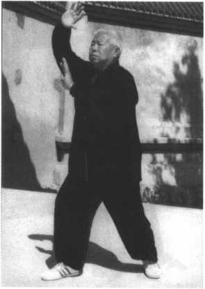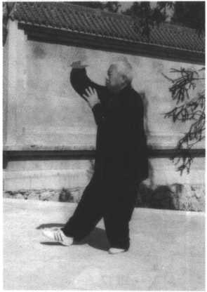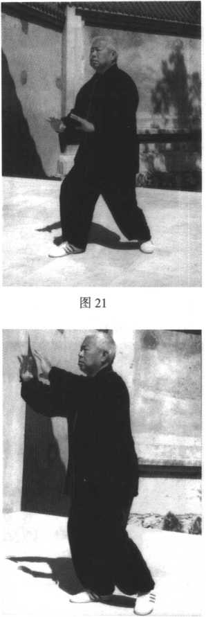 动作一:承前式,右腿 向西南方迈步,以足跟着 地,足趾上翘,两腿仍为左 实右虚;同时右手从右胯前 上拥至面前,左手由右小臂 内弧形下落至胸前,目视两 手前方(图19)。
