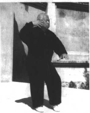 图.23图.23动作一:承前式,以右足 跟为轴,右足尖里扣,腰向左 转至面向正东;同时,左手外 旋弧形向左下至腹前,掌心 向下,右手内合至右额旁,目 视正东方(图23)。