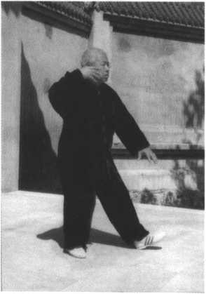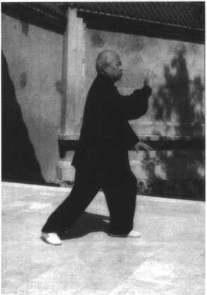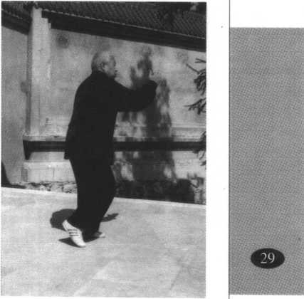 动作二:承前式,身体 向下松沉,意气贯注于右实 腿,左腿向东北方迈步,以 足跟着地,足趾上翘,目视 正东前方(图24)O