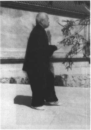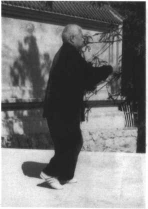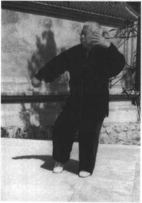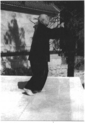 动作一:承前式,右腿 向后退半步后坐,左足收回 至右足左前方,以足尖点 地,两腿为右实左虚;同时, 右手拳变掌从左手臂上回 带,两手心向下,有下按之 意,目视正东前方(图35)0