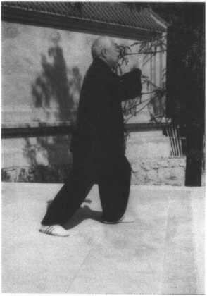 动作三:承前式,右足 向前跟步,至左足右后方, 以足尖点地,两腿为左实右 虚;同时两手有内合之意, 目视正东前方(图37)。