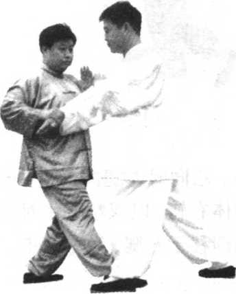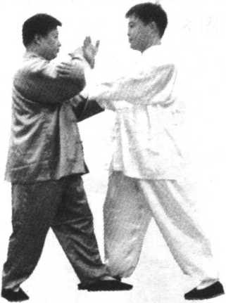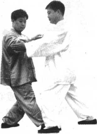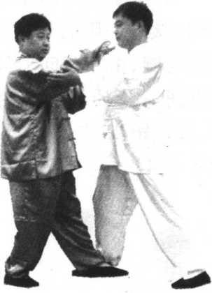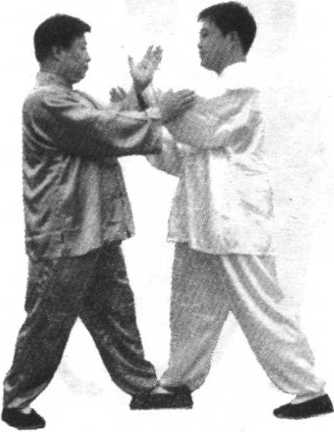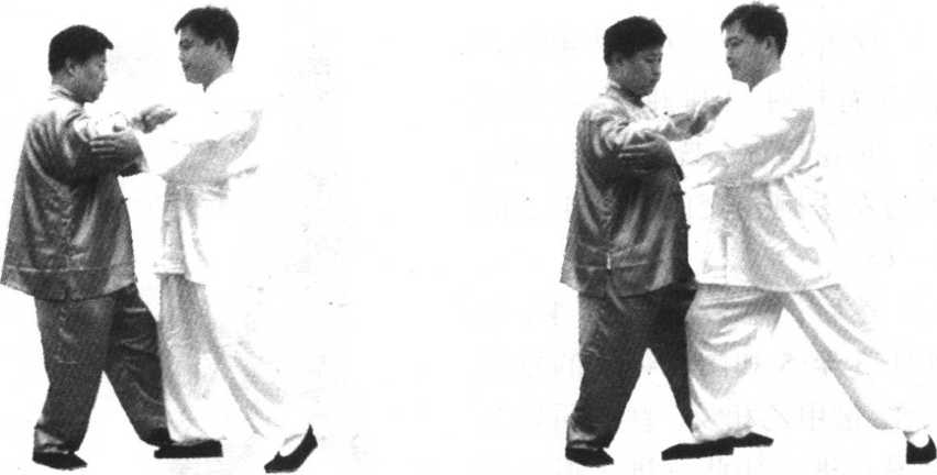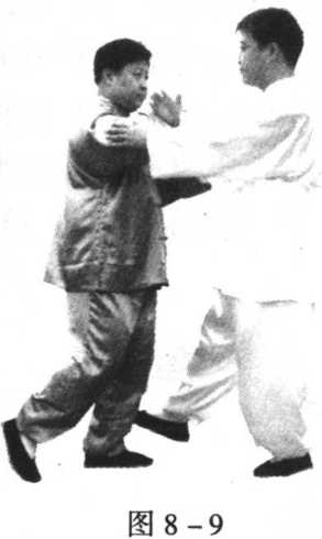 5 .甲顺对方的靠势腰右转;同时,右腿向后撤一步,随即 坐实,接着左脚向回提半步,以脚尖着地;并以双手沾粘住对方 右肘与腕,由左侧向上弧形往右下采。同时乙顺对方采势,右腿 向前进一步插入甲的裆内弓步踏实。接着左脚提起向前跟半 步,成左跟步,并以右肩靠击对方。成甲为采,乙为靠(图8 - 13、 图 8-14)。