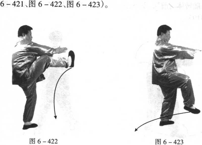 同时,腰微左转,右脚跟 提起,成右虚步状,重心渐渐全部移于左腿坐实;同时,腰微右 转,右腿随转腰屈膝提起,脚尖自然下垂,膝高与胯平,接着右脚 随转腰弧形 向上由左向 右横摆,以 脚背击打两 手掌,随即 垂下;两掌 姿势与高度 不变;眼神 顾及两掌向 前平视(图 6-420、图