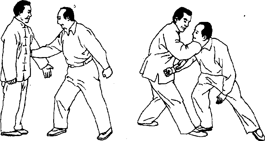 如对方以右拳击我前胸,我则以左掌采其腕部,同时以右