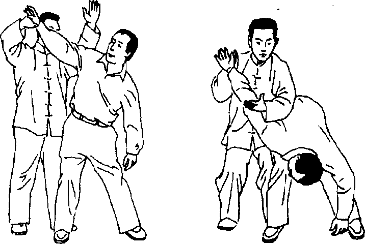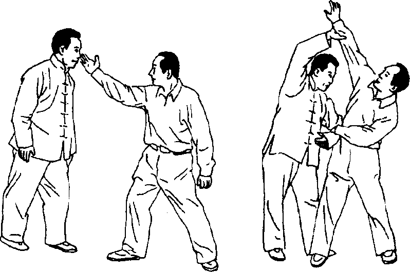 如对方以右掌从身之左侧击我面部时,我则向左转身,以 右手粘其右腕内旋上托,同时以左掌肘部粘其右肘内旋下沉, 并要涵胸拔背,屈膝略蹲,此时全身已产生了沉采之劲,则使 对方应手而倒伏于地。(图512.513^514.515).