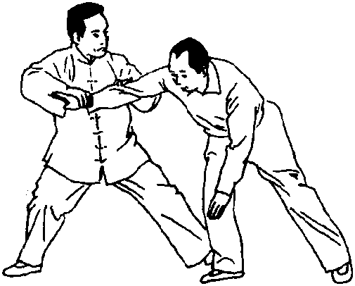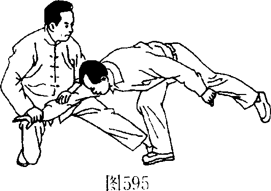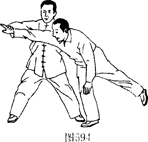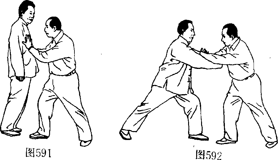 L命名释义此势系由高势变化为抵 势,即向前引手而向后撤身 还仆之义,故取此名。2.用法图593图593如对方用双手向我胸部 推来时,我则以右手粘其右 腕,左手粘其右肘,同时右脚 后撤一步,随同身子后撤之 势而捋其右臂腕向后、?向下 沉采,这时,对方则应手而向 前仆跌倒地。(图591.592. 593、594、595)图593图593