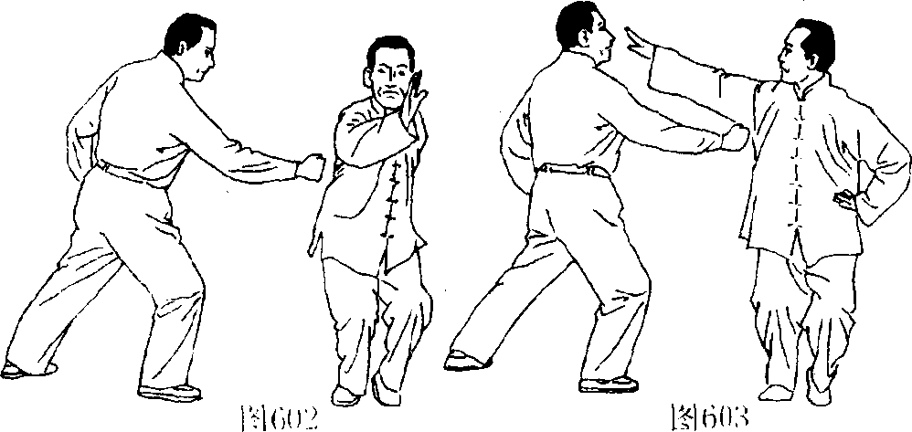 1 .命名释义图 6()5此动作系因形如风摆荷莲,复因其腿法系术语,如“里合 腿”、“外摆莲”之称,故取是为名。2.用法 *如敌以右手从我身后打来,我则向右转身以左掌粘其右 腕,复以右臂从其右臂下方向上穿出复向右方滚转下压,随之 抬起右腿以脚背踢其腰部,与此同时,左右两掌从右向左反击 其面部,这时,对方重心已失,则由我.任意击之。(606、607、 608.609.610.611)
