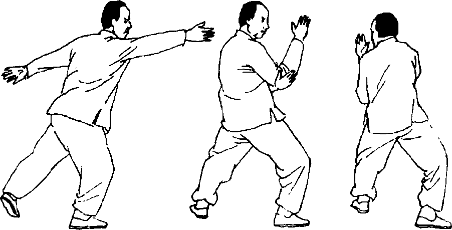 上述是左式,练完后接练右式。左式与右式动作相同,唯 左右姿势相反。(图327—330)