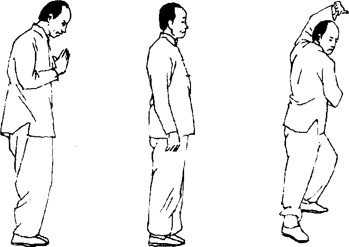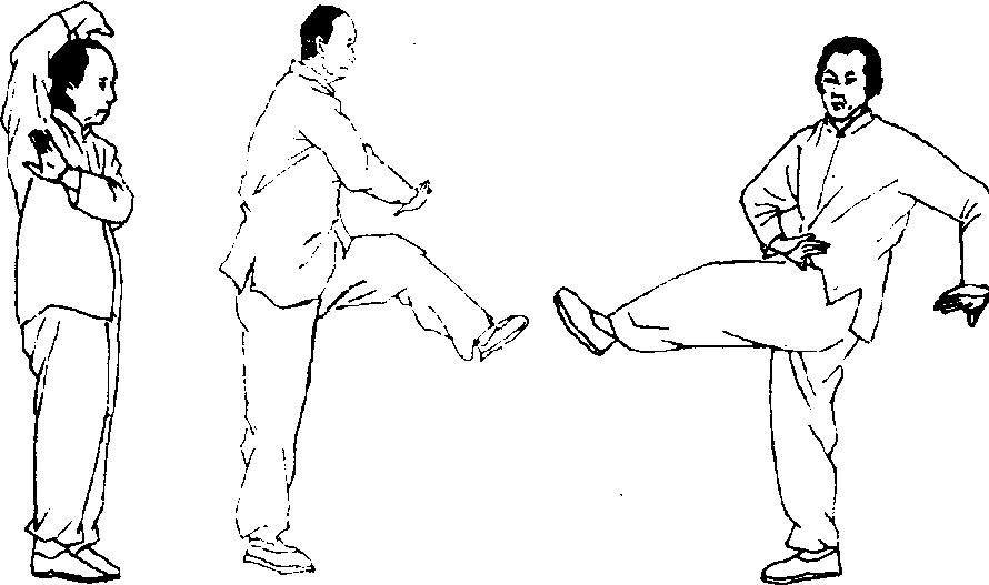 2. 右手绕过脑后向左脚方向按压。左手向身体左侧移至 极限,使两手虎口遥遥相对,手心向下。左脚在两手下落同时, 蹬地抽提移置于身前偏右侧,左膝与右胯平,左脚悬垂不落。 右脚单腿支撑体重。眼视右手食指尖。肩、肘、腕、胯、足各大 关节放松。肚脐回收,尾甑骨前钩。如此坚持时间愈长愈好, 此为平衡桩功。(图323.324正面图)