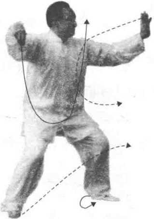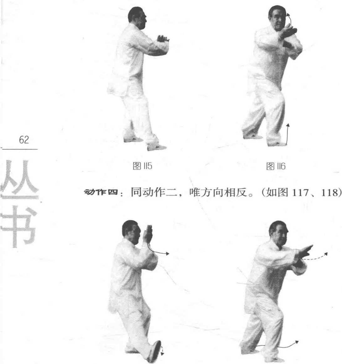 (面向东), 右脚向右前(东南)移动,屈膝成右弓步。同时,右手 外旋(手心向上),从左臂下穿出,并顺势向右平摆至东 南方向,左手随右臂而动,眼随右手而视。(图115、 116)