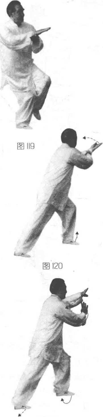 动作五:重心前移,左 脚向左前(东北)迈出,屈 膝成左弓步。同时,左手从 右臂下穿击,开始下一个穿 梭动作,但最后的“屈臂前 挤”改为“左臂搠架",右 手推按(向东北)。(如图 119、120、121、122)接下 去的最后一个穿梭是向西北 方向完成的,其转身动作与 动作三相同,手法为右臂搠 架,左手推按。(如图123、 124、125、126)