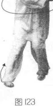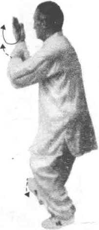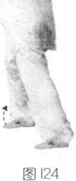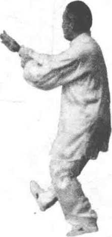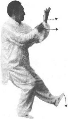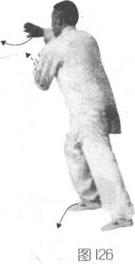 动作:体微左转(面向 西),重心后移,坐身于左腿, 右脚稍向左前移动,脚尖上翘 成右虚步。右手臂外旋,成侧 掌伸向前方,手指与鼻齐高, 左手附于右臂内侧,目视前 方。(如图127)以下动作同第 2式(略)。