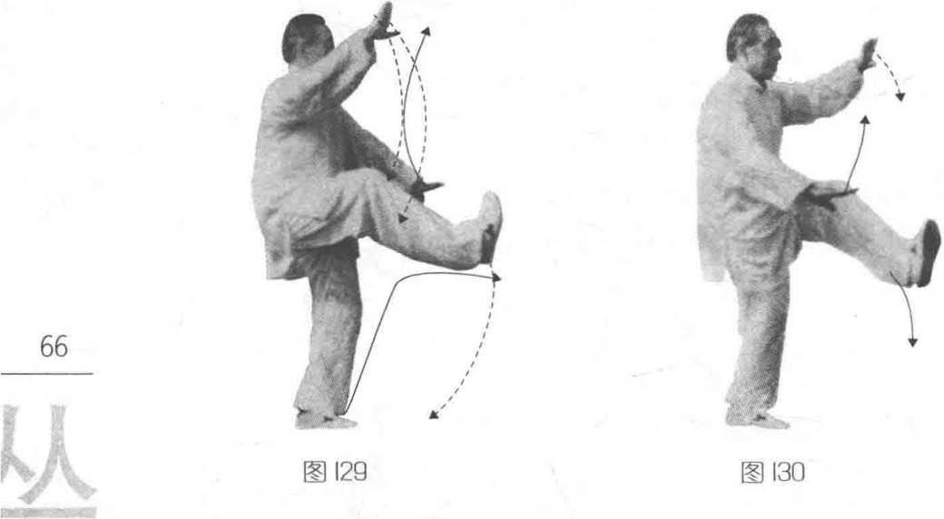 动作二:右脚前落,重心移于右腿,两手如上动在 体前上下交错(左外右内)分拨。同时提左脚向前蹬踹。 目视前方。(如图130)