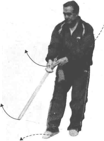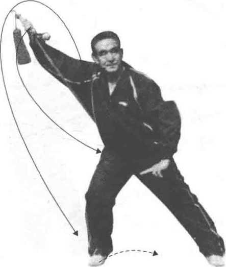 扫之势,屈臂(手心向下) 在头上(平剑)向后向左云 转,左手剑指与右手合拢, 以助其力(过渡式)。(如图