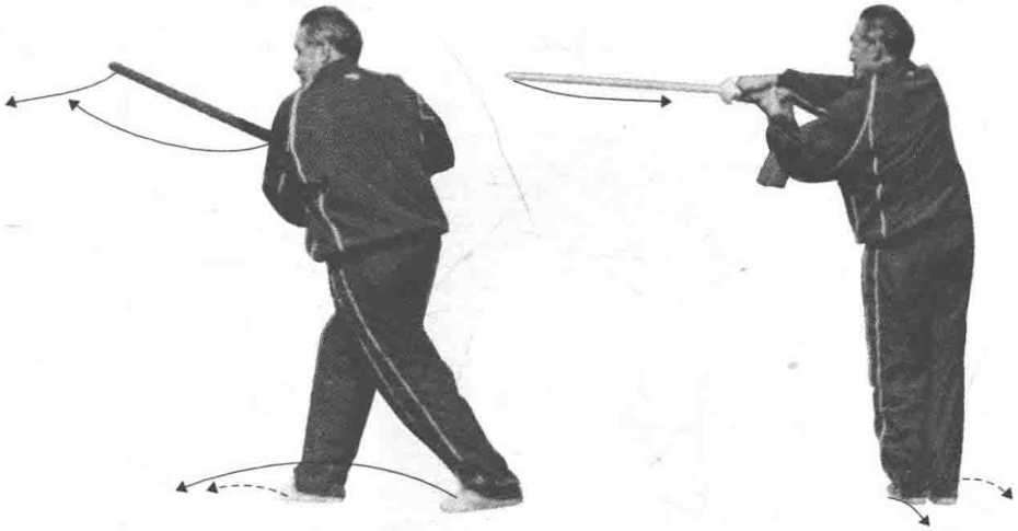 动作一:体右转90。,伸左腿重心前移,右脚跟内 转,屈膝成右叉步。同时右手持剑内旋,左手在右手后 握把(双手握剑),并收带于胸前,剑尖斜上,刃上下。 接着,左脚向左侧(西)迈出一步,右脚跟进成并步式。 同时两手持剑向左侧平刺(右臂伸直,左臂稍屈),刃上 下。身正,目视剑尖方向。(如图174、175)