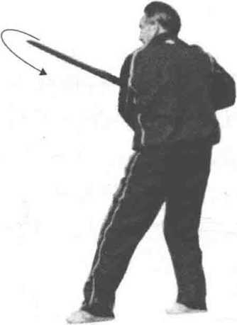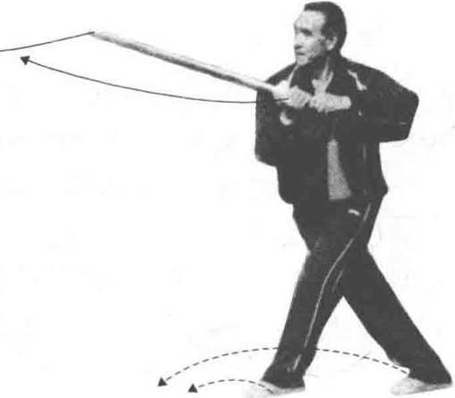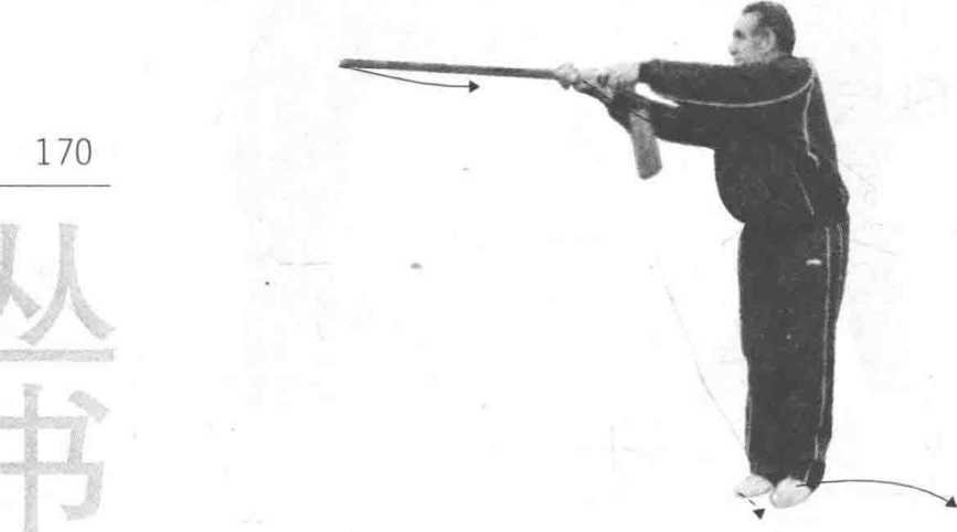 技击含义:敌枪从身后刺我腿, 我退步向右后截其枪,随即撩挑其身。 如敌使用短械进攻,我亦可做“进步 撩阴”(见光盘)。