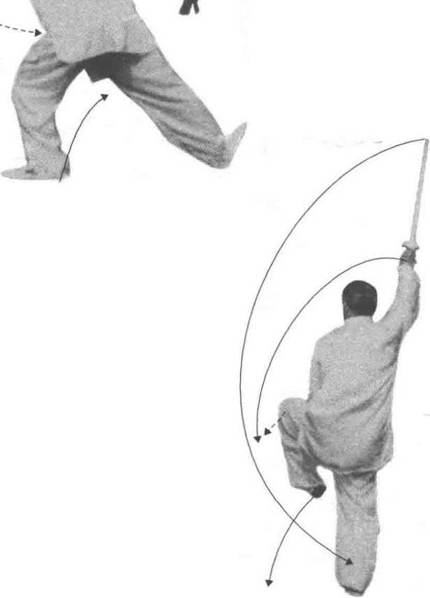 到作一:右脚向后(东)退一步,并屈左膝成左弓 步。同时右手持剑,向右后反撩(虎口向下),下刃向 上,剑尖高与胯齐,左手松握成剑指,伸向左侧(虎口 向下)。体微前倾,目视剑尖方向。(如图182)