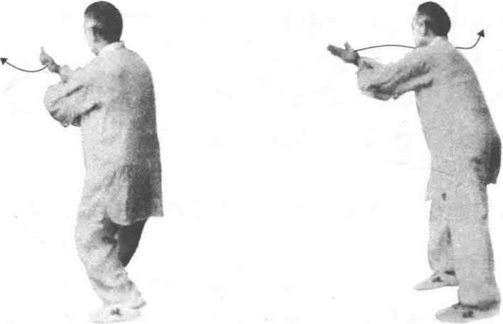 技击含义:①敌以右手猛力推 击我身,我用右手掳掠其腕,向右 后转体,并向下向后捋探之,使其 向前倾。同时左手扶搬其肩臂以助 力(防彼肘击肩靠),如此可使其向 转身方向跌出。②同搂膝拗步。