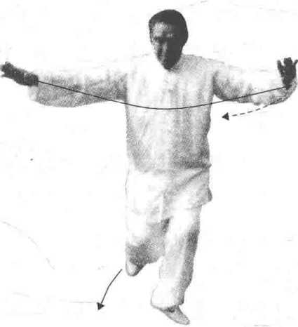 动作:左脚跟内收(脚尖向东),重心移于左腿,体 向左转135。(面向东),右脚顺势向西南方移动(使移