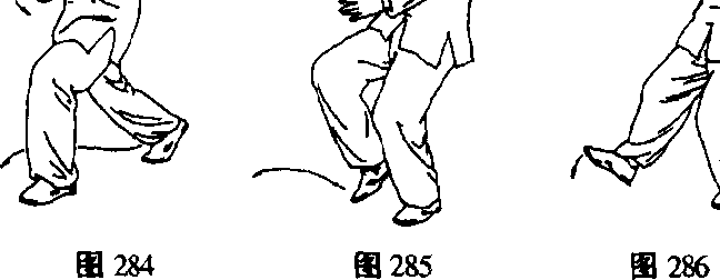 左脚尖外摆,右前脚掌随重心前移自然碾转;同 时上体左转,右掌伸于体前与胸高,左掌收于腹前,两 指尖向前,目视右掌方向(图284)。