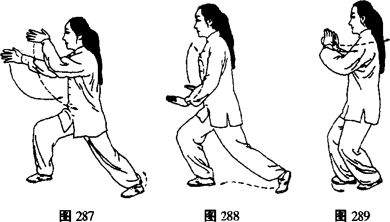 重心前移成右弓步;随上体右转两掌向前插出, 右掌在前与胸平,左掌在后同头高,两指尖向前,掌心 斜相对,目视右掌方向,成势向西(图287)o