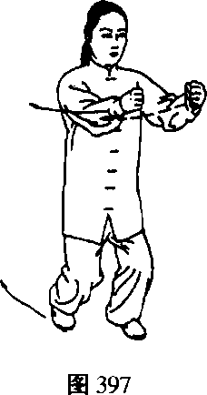 右脚向右后撤步,两拳稍前伸,目视两拳方向(图 398) o