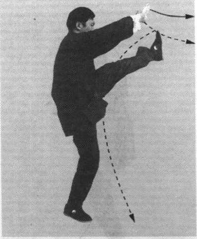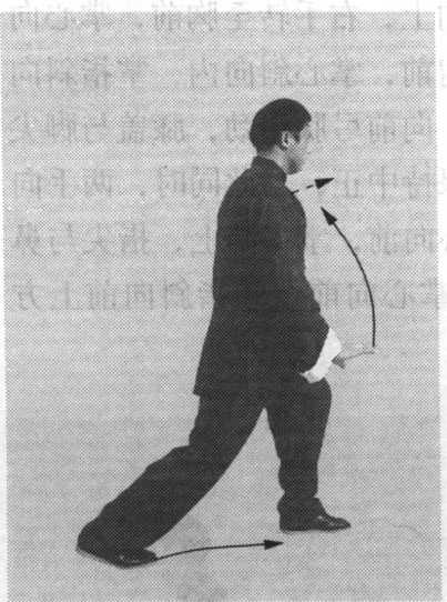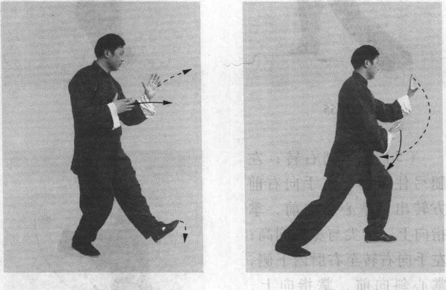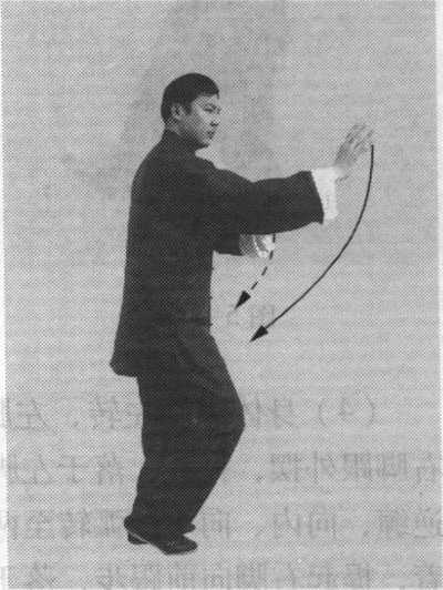 (2)身体稍右转;右腿弓 住塌劲,身体重心移至右腿;