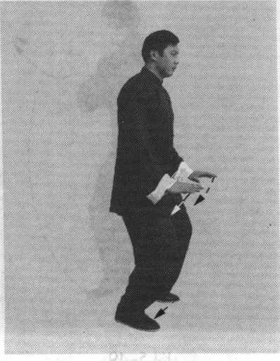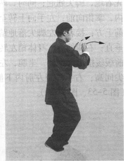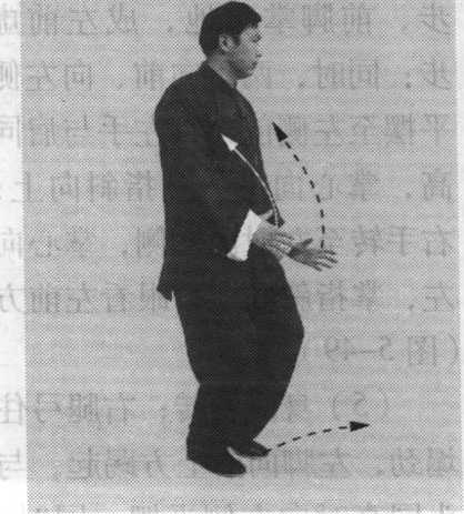 图 5-50图 5-50提起左脚向内收转至右脚的‘左前侧,前脚掌着地;同时,两手 顺缠,向内收转,右手至腹前,掌心向内,掌指斜向前下方; 左手收至左胯前,掌心向内,掌指斜向前下方(图5-52 )。