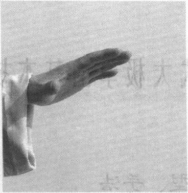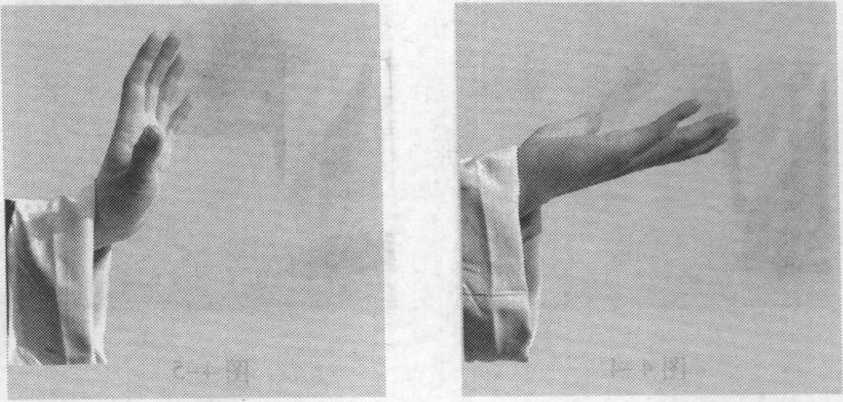 (1)掌:五指自然伸展,略分开,虎口撑圆,掌心略内收 成凹型。掌指向上,掌心向前,为立掌(图4-1)。掌心向上, 为仰掌(图4-2 )o掌心向下,为俯掌(图4-3 )o