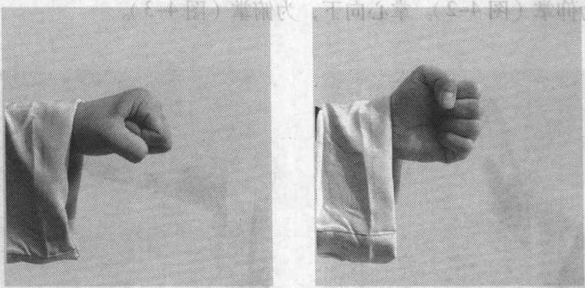 (2)拳:四指向内卷曲,拇指压于中指、食指的第二关节 上。拳心向下为平拳(图4-4)。拳眼向上,拳心向一侧,为 立拳(图4-5 )o