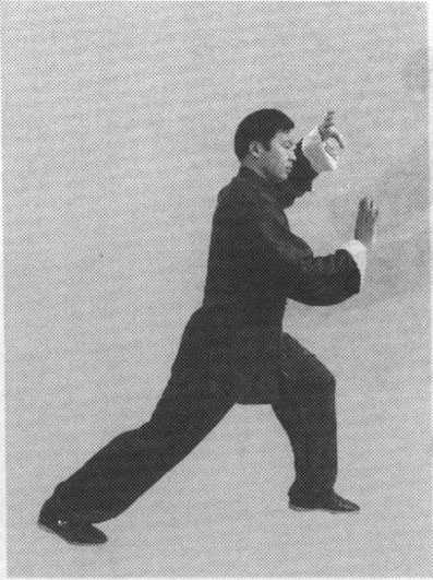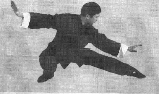 (1)弓步:预备势。两脚并拢,身体自然直立,肩臂松 垂;两手轻贴两腿外侧,头颈正直,两眼平视。提起左脚向前 上步,随之向前弓膝塌劲,膝关节与脚尖垂直,右腿蹬直,成 左弓步。右势与左势相同,方向相反(图4-18)。
