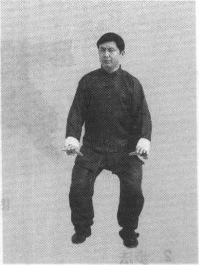(2)马步:预备式与弓步相同。接着,身体重心移向右 腿,提起左脚向左平行开步,与肩同宽,随之两腿屈膝下蹲, 成马步(图4-19)。