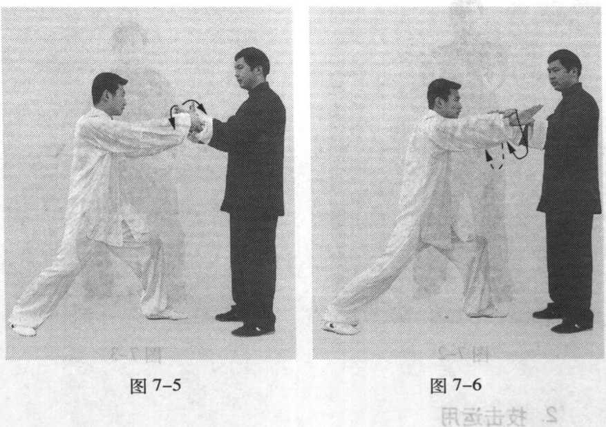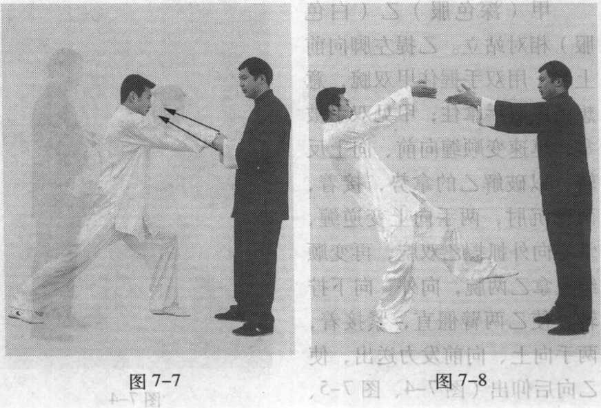 甲(深色服)乙(白色 服)相对站立。乙提左脚向前 上步,用双手握住甲双腕,意 想将甲双手拿住;甲见双手被 拿,迅速变顺缠向前、向上反 转,以破解乙的拿势,接着, 两臂沉肘,两手向上变逆缠, 掌心向外抓握乙双腕,再变顺 缠反拿乙两腕,向外、向下拧 转,使乙两臂僵直,紧接着, 两手向上、向前发力送出,使 乙向后仰出(图7-4、图7-5、 图 7—6、图 7-7、图 7-8)。