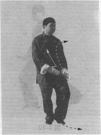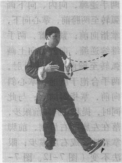 (4)跟步合抱:身体 稍左转,左腿弓住塌劲, 右脚跟抬起外展;同时, 两手逆缠,向内、向下画 弧转至两胯前,掌心向下, 掌指向前;紧接着,两手 继续逆缠,向外、向上画 弧转至胸前,两臂屈肘, 两手合抱于胸前,掌心斜 向前,掌指斜向上;与此 同时,提起右脚向前跟步, 落在左脚的右后侧,前脚 掌着地,成右后虚步;眼 法不变(图7-12,图7- 13)。(胸向东南)