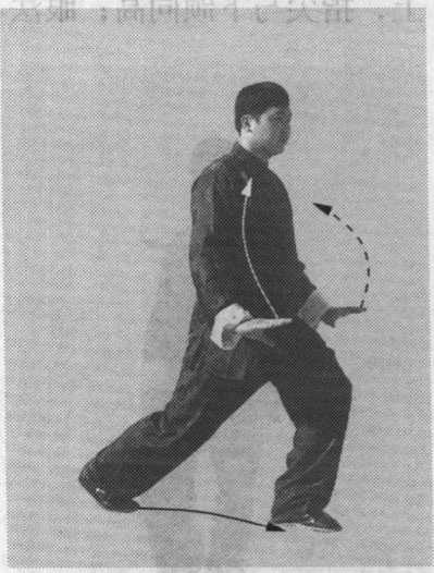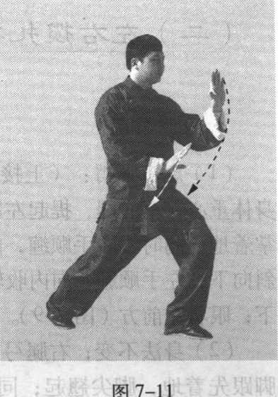 (2)身法不变;右腿弓膝塌劲,提起左脚向左前方上步, 脚跟先着地,脚尖翘起;同时,右手向上转至胸前,掌心向 内,掌指向前;左手向上转至左肩前,掌心斜向前,掌指斜向 上,指尖与下颌同高;眼法不变(图7-10)。