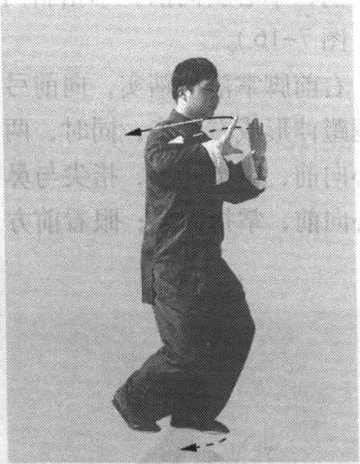 (1)虚步下捋:(上接起势)身体左转;右腿弓膝塌劲, 身体重心移至右腿,提起左脚向内收转,落至右脚内侧,前脚 掌着地;同时,右手顺缠,向内收转至腹前,掌心向内,掌指 斜向下;左手顺缠,向内收转至左胯前,掌心向右,掌指斜向 下;眼看左前方(图7-9)。