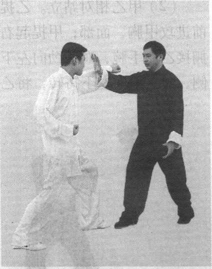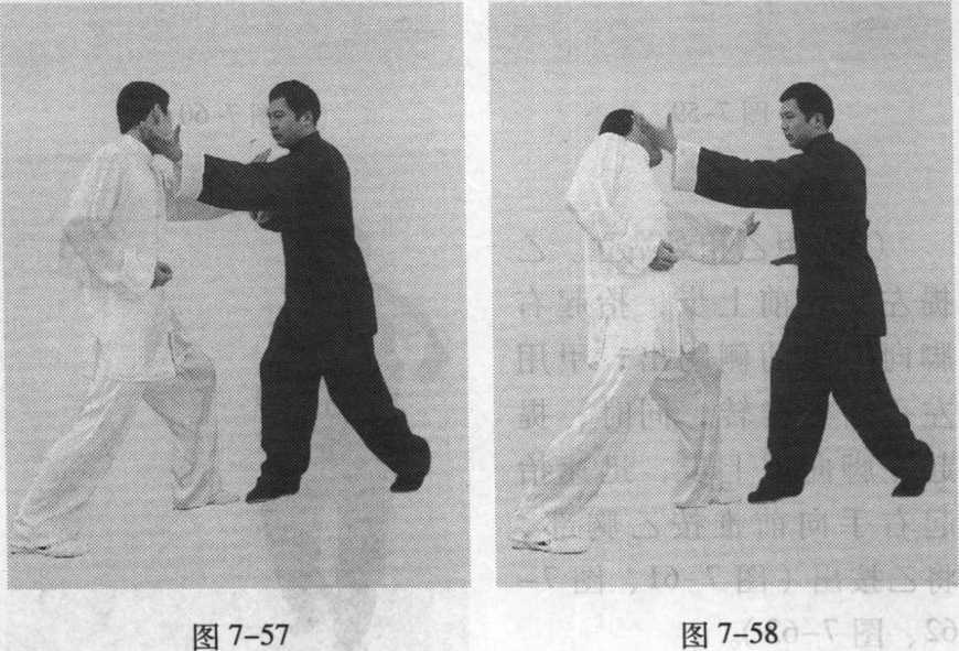 图 7-56(1)甲乙相对站立。 乙提左脚向前上步,同时 用左拳向甲进攻,欲击打 甲的面部;甲提起右脚向 前上步,同时迅速抬起右 手向前搠接乙左臂内侧, 顺乙劲向右上方引采,抬 起左手向前猛击乙右侧颈 部,将乙打出(图7-56、 图 7—57、图 7-58)。图 7-56