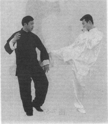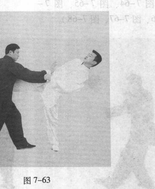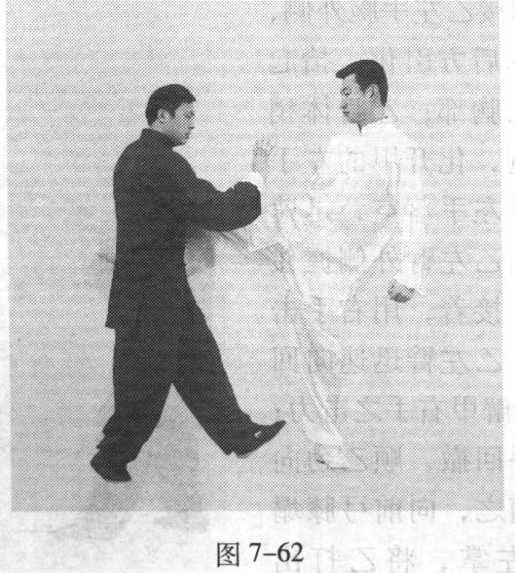 (3)甲乙相对站立。乙 提左脚向前上步,抬起右 脚向甲左肋侧踢出;甲用 左手向外搂转,同时,提 起左脚向前上步,迅速抬 起右手向前推按乙胸部, 将乙按出(图7-61、图7- 62、图 7-63)。