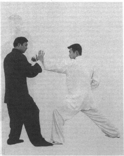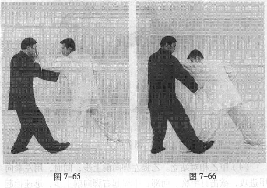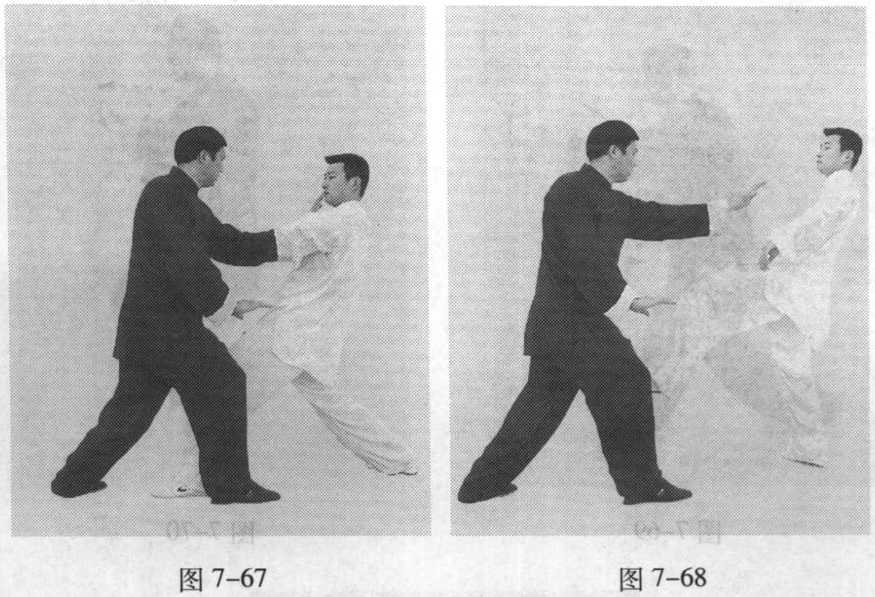 图 7—64右手向前搠接乙左手腕外侧, 顺乙劲向左后方引化,抬起 左手击打乙胸部;乙身体稍 后撤,含胸,化开甲的左手 击打;甲见左手落空,迅速 屈肘,手贴乙左臂外侧握住 向左引采,接着,用右手击 打乙左肋;乙左臂迅速向回 收转,以化解甲右手之击力; 甲见乙左手回撤,顺乙劲向 前推按,随之,向前弓膝塌 劲,力达左掌,将乙打出 (图 7-64.图 7-65.图 7- 66、图 7-67、图 7-68)。