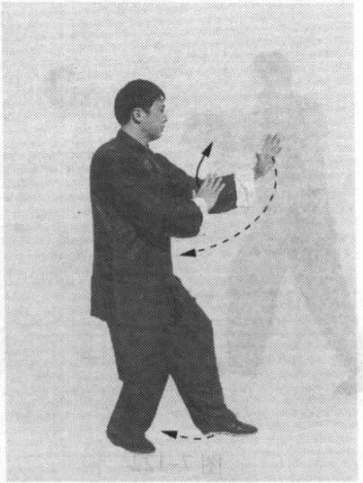 1.动作练习图 7-123(1)虚步抱掌:上接图7-114, 身体重心前移至左腿;提起右脚向 前跟步,落在左脚的右后侧,前脚 掌着地,接着,脚跟落地踏实,身 体重心移至右腿,提起左脚向前活 步,前脚掌着地;同时,左手顺 缠,左臂松肩沉肘,立掌,掌心向 右,掌指向上;右手顺缠,向前、 向上提起,转至左肘内侧,掌心斜 向左,掌指斜向上;眼法不变(图 7-123、图7-124 )。(胸向正东)图 7-123图 7-124图 7-124