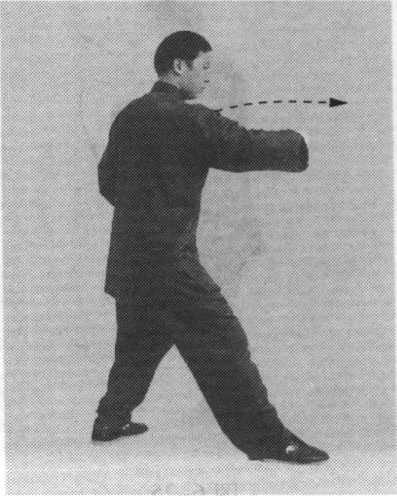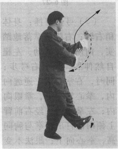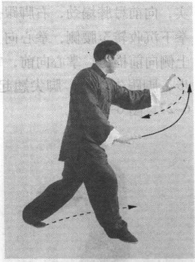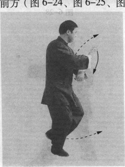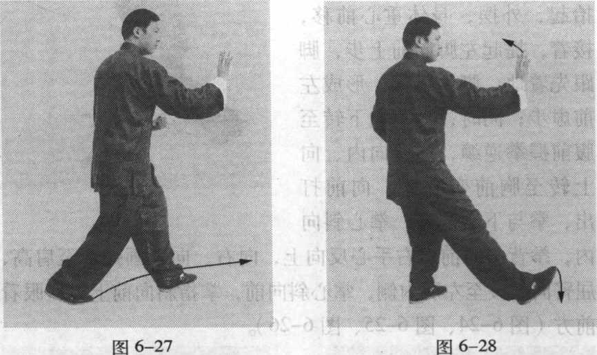 图 6-24(1)进步搬捶:身体稍右 转;右腿弓膝塌劲,右脚尖外 摆,随之,左腿屈膝,左脚跟 抬起,外摆,身体重心前移, 接着,提起左脚向前上步,脚 跟先着地,脚尖翘起,形成左 前虚步;同时,左手向下转至 腹前握拳逆缠,屈臂向内、向 上转至胸前变顺缠,向前打 出,拳与下颌同高,拳心斜向 内,拳背斜向前;右手心反向上,向右、向上画弧转至肩高, 屈臂向内按至左肘内侧,掌心斜向前,掌指斜向前上方;眼看