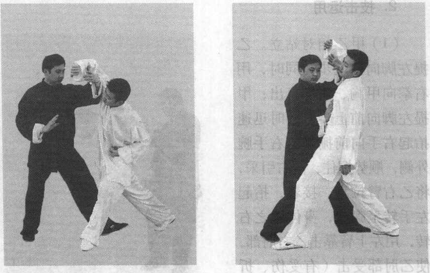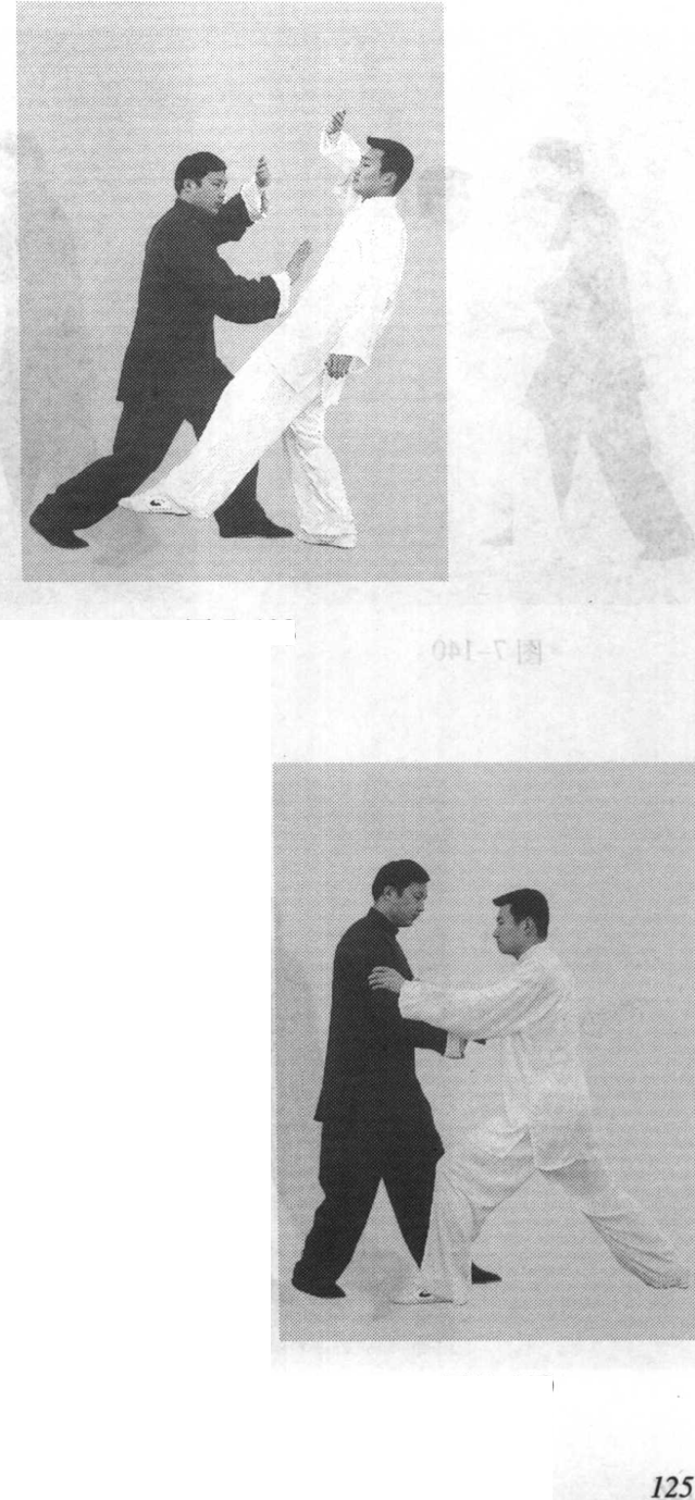 (2) (3) 甲 提左脚向前上步,落至乙左 脚内侧,同时,左臂屈肘, 向前上方抬起至乙右臂下侧, 紧接着,左手逆缠向前上方 搠架乙右臂,迅速抬起右手 向乙胸部推按,发力,将乙 按出(图 7-136、图 7-137、 图 7-138 )o图 7-138图 7-138图 7-139图 7-139