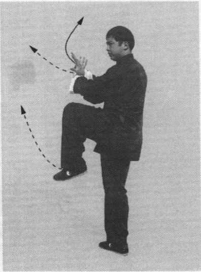 图 7-209(1)右独立抱掌:上接图 7-205,身体稍右转;右腿弓住 塌劲,左腿屈膝提起,脚尖自然 下垂,石腿自然伸直,形成右独 立势;同时,右手逆缠,向右、 向上画弧转至肩高,屈肘向内转 至胸前,掌心斜向前,掌指斜向 上;左手向下、向内转至右腕外 侧,掌心斜向前,掌指斜向上; 眼看左前方(图7-209 )o