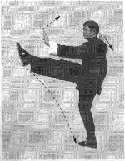 (2)独立分脚:右腿弓 住塌劲,左脚向左前上方弹 起,脚尖绷平;同时,两手 向左右分展,左手转至左腿 上侧,掌心向前,掌指向 ±;右手转至右侧前方,掌 心向右,掌指向上;眼看左 前方(图7-210)。(定势 动作向西南)